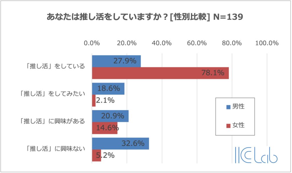 「推し活の状況」について、男女別で分析を行なったところ、女性の推し活実施比率は、78.1%と高い値を示した。一方で男性は、27.9%だった。