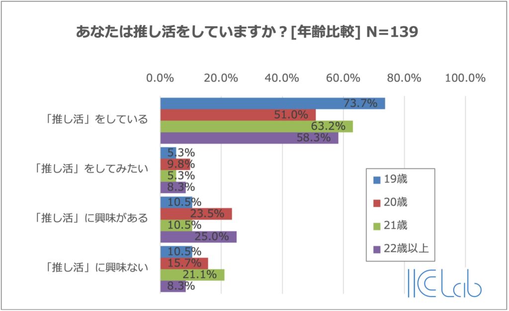 「推し活の状況」について、年齢別で分析を行なったところ、19歳の推し活実施比率が73.7%と高い傾向が確認できた。より若い年齢ほど推し活の実施が高い傾向が確認できた。