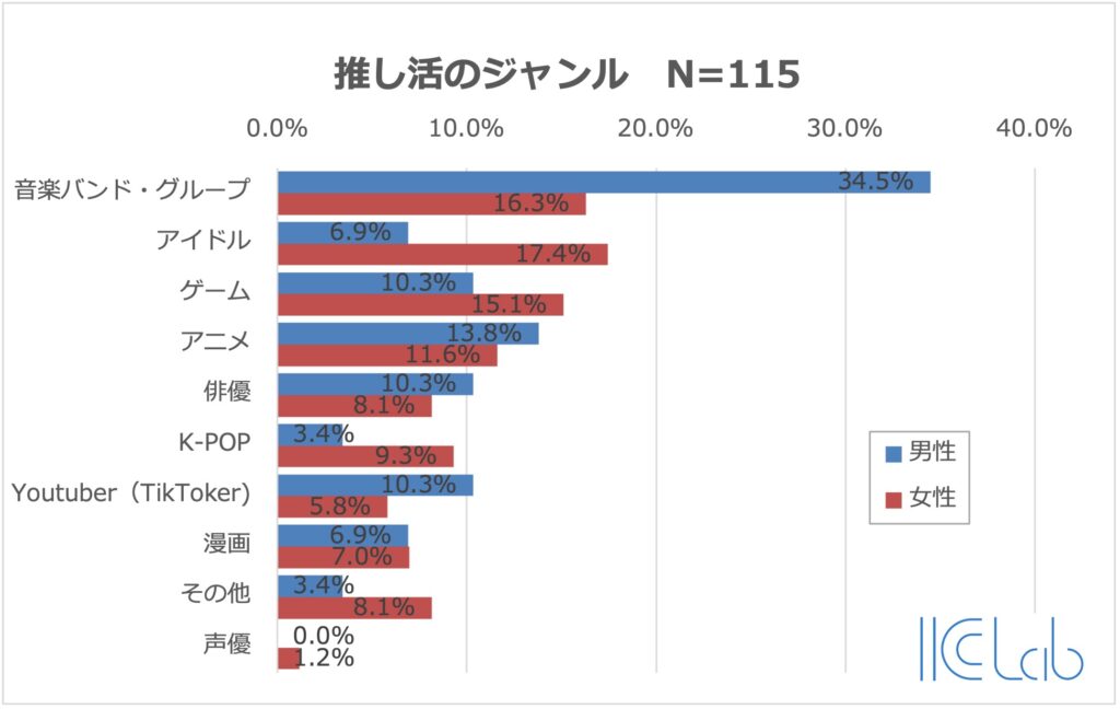 推し活をしている人(115名)に、最も推しているジャンルを調査したところ、男女で大きな差が確認できた。男性は、「音楽バンド・グループ」への推し活をしている比率が34.5%と最も高い結果だったことに対し、女性は、「アイドル」が17.7%、「音楽バンド・グループ」が16.3%、「ゲーム」が15.1%と分散する傾向がみえた。その他のジャンルでは、ヒアリングの結果、スポーツ選手、インフルエンサーやゲーム実況、身近な友人知人の名前が挙がっていた。