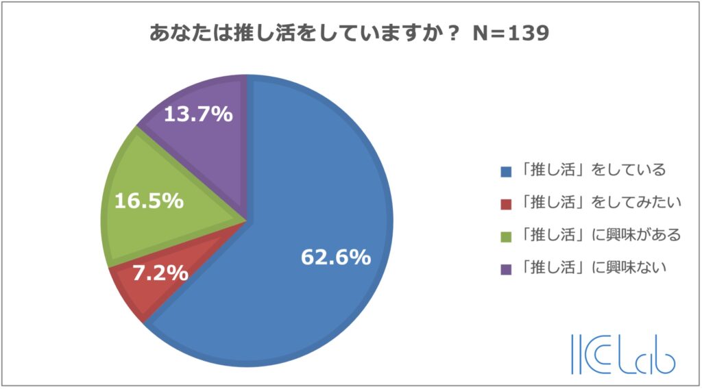 山形市にある東北芸術工科大学に在籍している大学生の男女139名にアンケート調査を行ったところ、「推し活をしている」と回答した対象者が87名(62.6%)だった。一方で、「推し活に興味がない」と回答した対象者は、19名(13.7%)で、推し活に興味がない層がマイノリティーとなる結果となった。また現在、推し活をしていない大学生でも、推し活に興味関心がある層(してみたい、興味があるとの回答者)は、23.8%となり、これから、推し活を行う比率が増えていくことが確認できた。